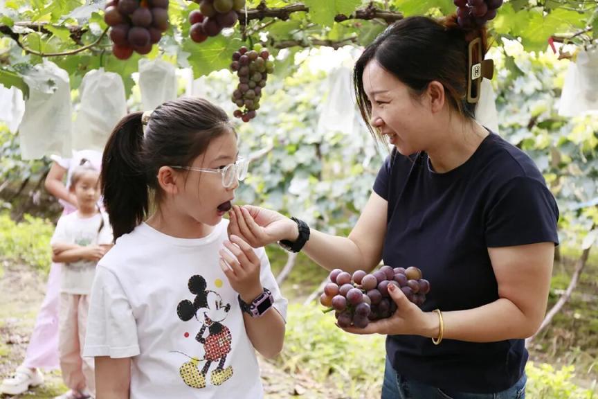 上午9时,园区内已迎来不少举家前来的游客。他们穿梭在藤蔓间,或踮脚仰头仔细挑选饱满的葡萄串,或手持剪刀小心翼翼剪下果实,孩子们举着刚摘下的葡萄,兴奋地向家长展示,脸上洋溢着灿烂的笑容。