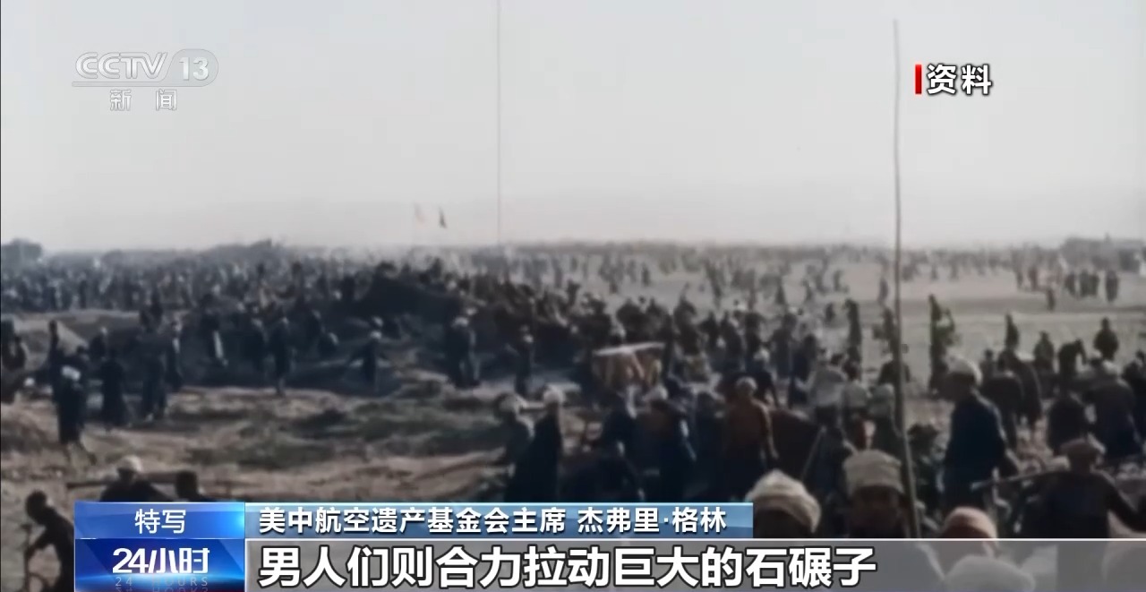 美中航空遗产基金会主席 杰弗里·格林:妇女们背上背着孩子,坐在地上把大石块敲成小石子;孩子们再把小石子捡到指定地点;男人们则合力拉动巨大的石碾子,有时候要100个人才能拉动一台10吨重的石碾子,就为了把跑道压平整。无论是寒冬还是酷暑,妇女们敲碎的每一块石头,都是在为机场出力,为飞机起降创造条件,让美国飞行员能顺利升空抗击日军。这背后是一种信念:他们所做的一切都在为胜利搭建基础。